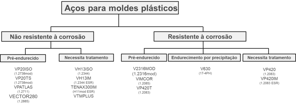 Os aços para moldes plásticos são geralmente classificados em duas categorias principais:aços não resistentes à corrosão, eaços resistentes à corrosão. Cada uma dessas categorias pode incluir materiais já fornecidos com tratamento térmico, ou que exigem tratamento posterior. O diagrama a seguir resume alguns dos principais tipos de aços empregados na indústria de moldes plásticos.