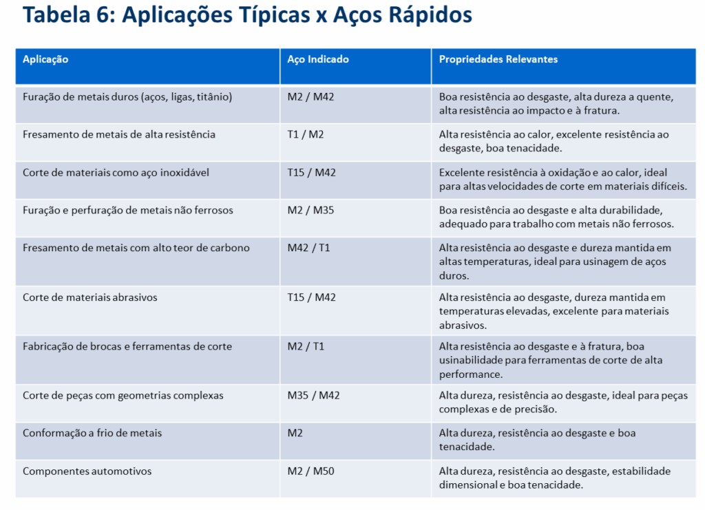 Tabela 6: Aplicações típicas x Aços Rápidos