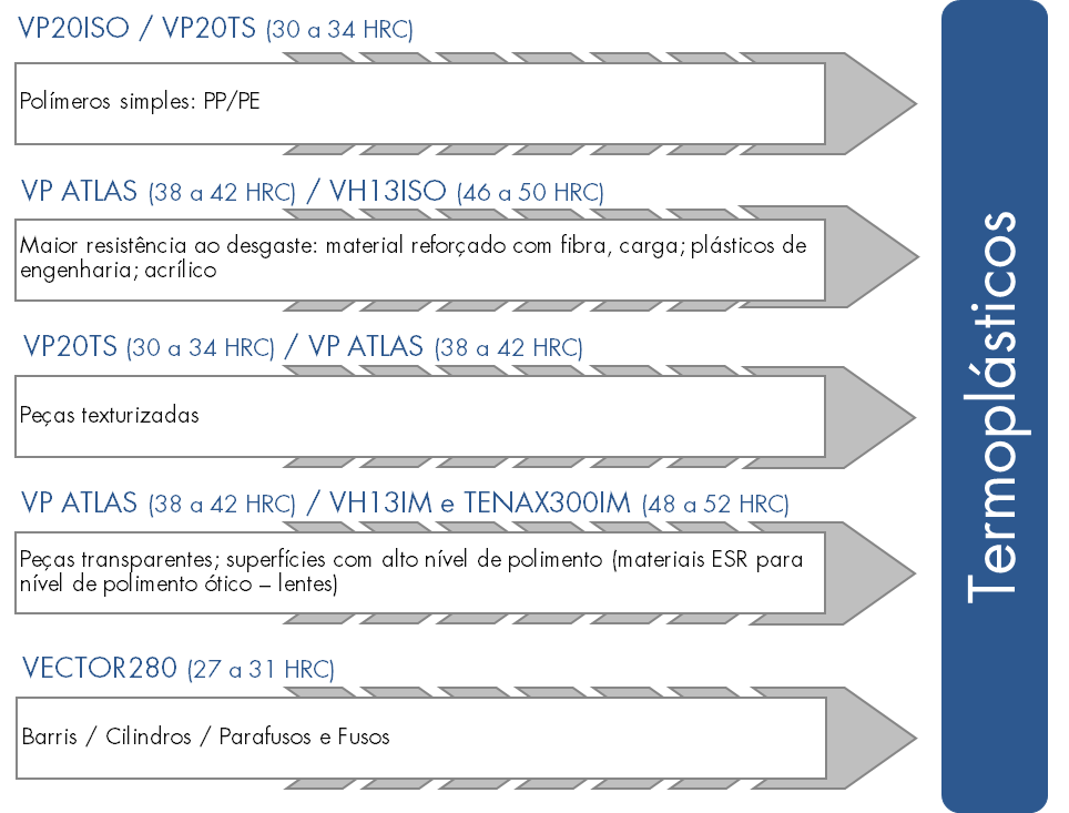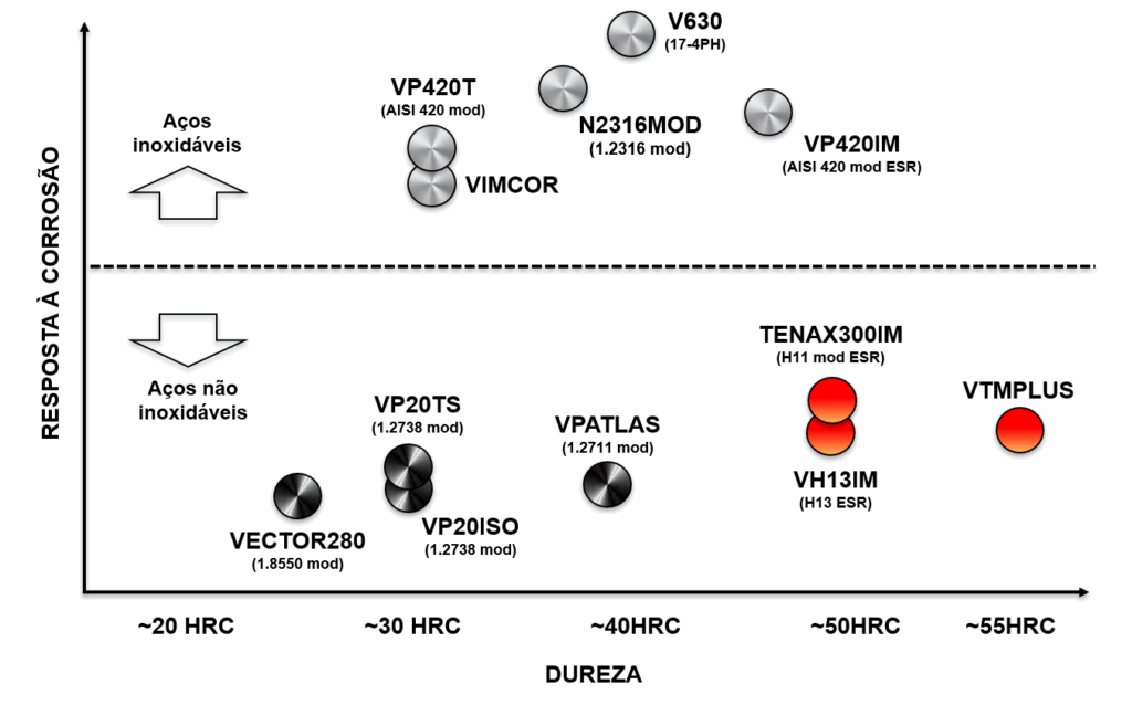 Abaixo segue um gráfico que posiciona os principais produtos Villares Metals mantidos em estoque para moldes plásticos.