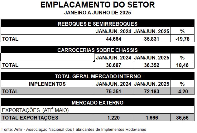 Dados divulgados pela Associação Nacional dos Fabricantes de Implementos Rodoviários (ANFIR), apontam que o desempenho de emplacamentos do setor produtor de implementos rodoviários no primeiro semestre de 2025 ficou 4,2% abaixo de igual resultado apurado no ano anterior. De janeiro a junho de 2025, a indústria distribuiu ao mercado 72.183 implementos rodoviários, contra 75.351 produtos no primeiro semestre do ano passado. O mercado de caminhões, de acordo com a Fenabrave, recuou -3,62% no primeiro semestre.