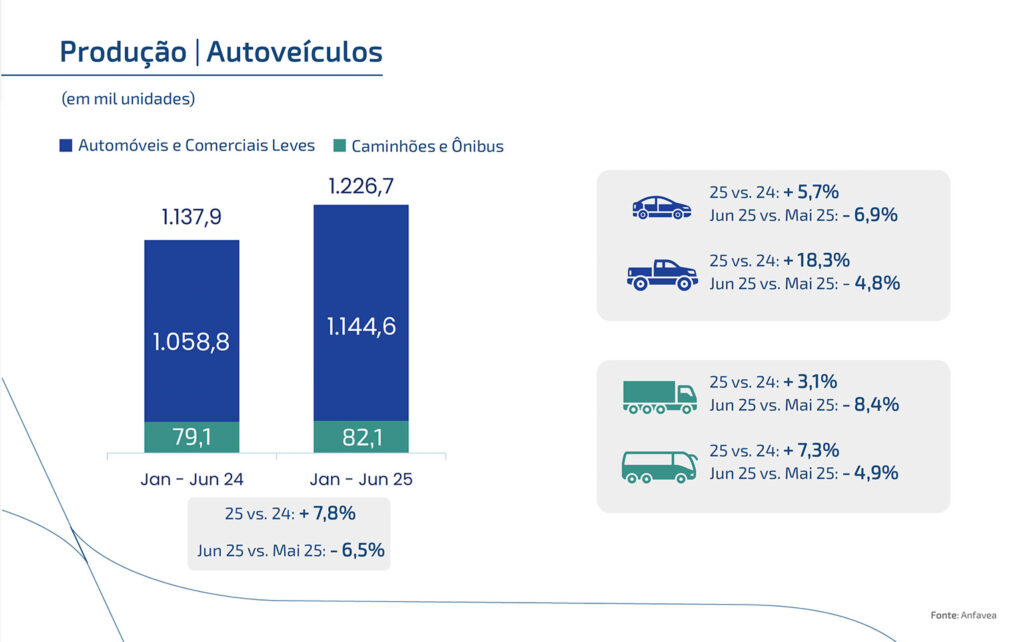Nos caminhões, os emplacamentos recuaram 3,6% no semestre. A produção subiu 3,1%, mas desacelera mês a mês. O destaque positivo foi o setor de ônibus: +7,3% na produção e +31,3% nas vendas.
