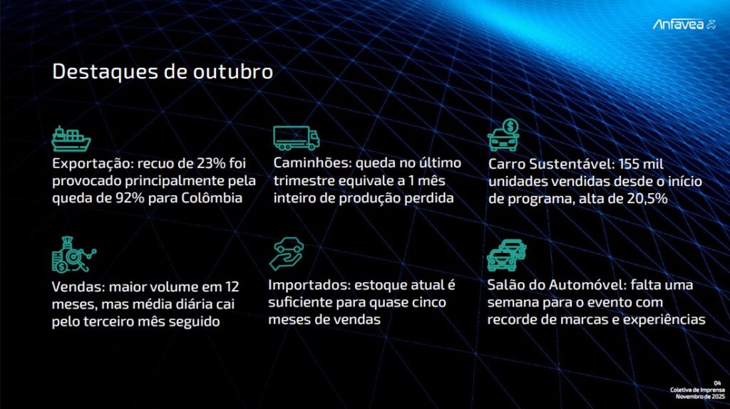 O maior desafio está nas vendas, porque, pelo terceiro mês seguido, a média diária ficou abaixo do ano anterior. O programa “Carro Sustentável”, que oferece veículos com preços menores, até ajudou a conter uma queda maior, com 155 mil unidades vendidas. Porém, juros elevados turbinam a crise dos caminhões pesados, com o acumulado deste ano indicando queda de 40% frente a 2024.