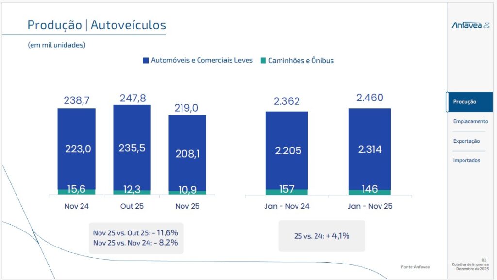 O cenário de desaceleração levou a uma queda relevante na produção do mês de novembro. As 219 mil unidades fabricadas representaram queda de (-) 11,6% em relação a outubro. Na comparação com novembro de 2024, a redução foi de 8,2%.
