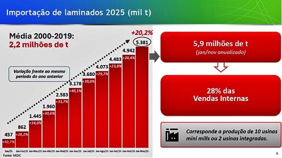 O Instituto Aço Brasil realizou em São Paulo sua última Coletiva de Imprensa em 2025, que com a presença de André B. Gerdau Johannpeter – presidente do Conselho Diretor, e também presidente do Conselho de Administração da Gerdau – e de Marco Polo de Mello Lopes, presidente executivo da entidade. O encontro destacou a preocupação com o avanço das importações predatórias, com produtos que são vendidos no Brasil abaixo do custo de produção, caracterizando dumping, prática condenada internacionalmente. Dados apresentados revelaram que os laminados em 2025 devem atingir 28% das vendas internas, ampliando a pressão sobre a indústria nacional. Por conta disso, o Instituto cobra medidas urgentes do governo para proteger o setor e conter o risco de desemprego no setor.