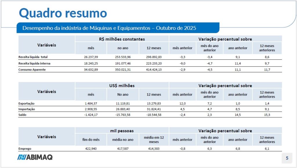 Segundo a ABIMAQ, entidade que reúne fabricantes de máquinas e equipamentos, a indústria brasileira voltou a desacelerar em outubro de 2025, após sinais de recuperação em setembro. A receita líquida caiu 3,4% frente ao mesmo mês de 2024, somando R$ 26,2 bilhões.