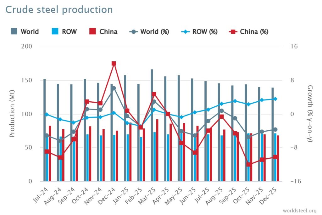 A China produziu 68,2 milhões de toneladas em dezembro de 2025, uma queda de 10,3% em relação a dezembro de 2024. A Índia produziu 14,8 milhões de toneladas, um aumento de 10,1%. Os Estados Unidos produziram 6,9 milhões de toneladas, um aumento de 3,6%. O Japão produziu 6,6 milhões de toneladas, uma queda de 4,8%. Estima-se que a Rússia tenha produzido 5,8 milhões de toneladas, uma queda de 4,4%. A Coreia do Sul produziu 5,2 milhões de toneladas, uma queda de 2,4%. A Turquia produziu 3,5 milhões de toneladas, um aumento de 18,5%. Estima-se que o Irã tenha produzido 3,0 milhões de toneladas, um aumento de 16,2%. A Alemanha produziu 2,7 milhões de toneladas, uma queda de 0,2%. O Brasil produziu 2,6 milhões de toneladas, uma queda de 1,9%.