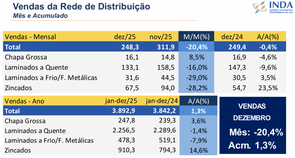 Segundo o Inda – Instituto Nacional dos Distribuidores de Aço no mês de dezembro de 2025, foi registrada uma queda de 20,4% nas vendas quando compradas a novembro. Foram vendidas 248,3 Mt contra 311,9 Mt de novembro. Em relação a dezembro do ano de 2024, a posição permaneceu praticamente igual com uma leve queda de 0,4%. Em dezembro de 2024 foram vendidas 249,4 Mt.