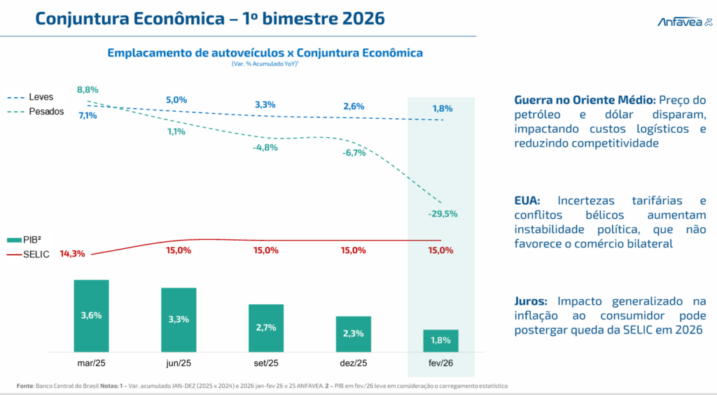 Fazendo uma análise do quadro atual o presidente executivo da Anfavea, Igor Calvet destacou que a guerra no Oriente Médio e as incertezas tarifárias nos Estados Unidos impactaram os custos logísticos e reduzem a competitividade da indústria, aliados a alta taxa SELIC (15%) e a inflação que têm atrasado sua redução em 2026.