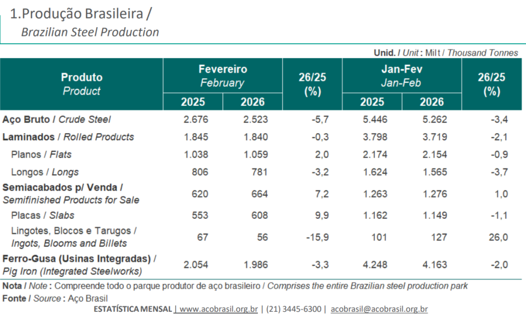 Segundo dados divulgados pelo Instituto Aço Brasil a produção brasileira de aço bruto atingiu 2,5 milhões de toneladas em fevereiro de 2026, o que representa uma retração de 7,9% em relação ao mês anterior e (-) 5.7% em relação ao mesmo mês do ano passado. No acumulado dos dois primeiros meses do ano, já se verifica uma retração de (-)3,4% em relação ao ano passado.